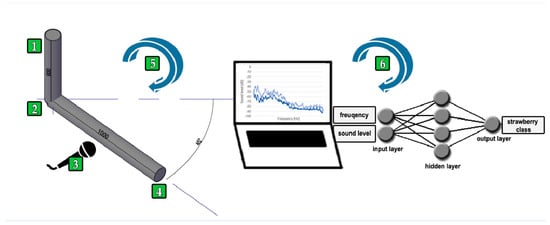 Scheme: 1–transport channel for dried strawberry fruit, 2–trapdoor controlling the speed of the uninhibited falling of fruits, 3–capacitor microphone, 4–dried fruit outlet dropping the dried fruit on the conveyor or into the glass filled with water, 5–import of the recorded sound to the PC and creation of the acoustic spectrum, 6–Artificial Neural Network (ANN) learning process with parameters determining the acoustic wave.