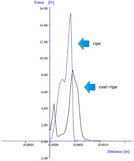 A test of the hardness of the dried strawberry fruits, taking into account their degree of ripeness with division into the ripe class and the over-ripe class, was also conducted (Figure 4). The research was conducted with the TA–XT2i Texture Analyzer (Stable Micro Systems, Godalming, Surrey, UK) []. One slice of the dried strawberry fruit with a total volume of mass of around 1 g was placed in the device. The microphone was put against the device in order to determine the frequency and the level of sound. The test of hardness was done in series of 20 repetitions for trials in the ripe and the over-ripe classes.