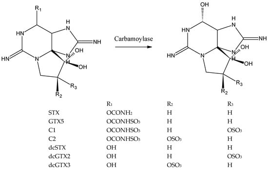 The purpose of this study was to develop an assay for the detection of N-sulfocarbamoyl PSTs based on the enzyme carbamoylase. Carbamoylase catalyzes hydrolysis of the carbamate (R1 = –CONH2) or N-sulfocarbamoyl moiety (R1 = –CONHSO3) of PSTs, turning them into the corresponding decarbamoyl analogues, dcSTX in the case of STX or GTX5, dcGTX2 in the case of C1 and dcGTX3 in the case of C2 (Figure 1) [,].