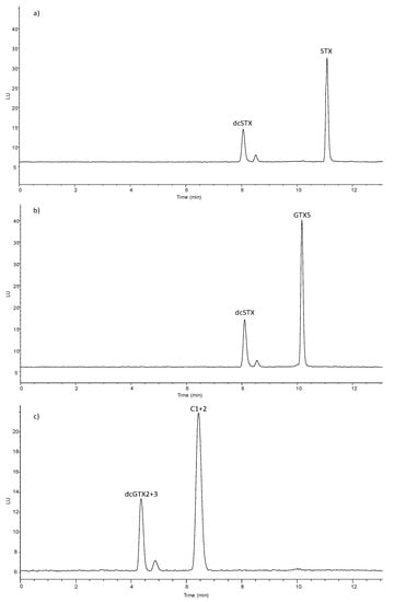 LC-FLD chromatograms obtained analyzing the reaction mixture of carbamoylase with toxin solutions STX (a), GTX5 (b) and C1+2 (c).