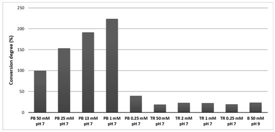 Substrate (GTX5) conversion degree by carbamoylase in buffers with different composition and pH. PB—phosphate buffer, TR—Tris buffer, B—borate buffer. Conversion degree values were normalized w.r.t. 50 mmolL−1 phosphate buffer.