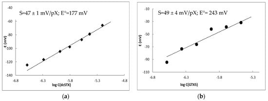 The enzymatic assay was run in solutions with GTX5 concentrations ranging from 0.43 to 3.34 µmolL−1, which were measured using the potentiometric sensor after incubation. Response of the sensor to GTX5 concentration in the assay was found to be 49 mV/pX (Figure 6b). The slope obtained in the assay was not statistically different (p = 0.05) from the one obtained for dcSTX alone, confirming the possibility to determine GTX5 through the quantification of the product of its enzymatic hydrolysis. Standard potential of the sensor differed being higher in the case of the assay. This deviation can be related to the presence of the enzyme or other compounds in the enzyme solution added to the assay.