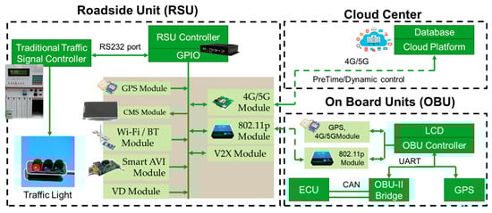 The architecture of the proposed STSC system is shown in Figure 1, and it is composed by three subsystems including an RSU, an OBU, and a cloud center. The RSU controller, connected to traffic signal control system, is the key component in STSC. It is implemented by an industrial computer designed by modularization concept where multiple external modules can be flexibly added onto the RSU by the general−purpose input/output (GPIO) interface. The supporting peripheral modules includes 802.11p V2X interface, GPS, changeable message sign (CMS), mobile communication (4G), and Wi-Fi/BT modules. In addition, the RSU has more GPIO for real-time traffic information extension, such as loop detector or video traffic analyzer (smart AVI).