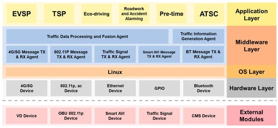 An application layer, which is the pool of the application programs, supports six smart city applications including emergency vehicle signal preemption (EVSP), transit signal priority (TSP), eco-driving by signal plan broadcasting, roadwork and accident warning, pre-time signal control, and adaptive traffic signal control (ATSC). Middle layer is the kernel of the RSU, where seven important agents are designed. Traffic data agent and traffic information generation agent are responsible for the data processing and data fusion collected from external data sources (loop detector and smart AVI) to generate real-time traffic information for ATSC. Five message TX/RX agents are designed for dealing with message transmitting and receiving on five device channels, where buffers, queues, and priority mechanisms are designed to handle the different kind of events and messages from other agents. The operating system layer is based on Linux OS and the hardware layer is the driver layer for multiple hardware access interfaces. The external modules handle the input/output interfaces for accessing different external modules, such as CMS module, Smart AVI module, 802.11p modules.