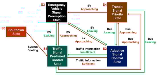 In order to integrate multi-modal transportation applications in an RSU controller, a five-status state transition diagram for the RSU controller is designed as illustrated in Figure 3, where the state transition condition and control flow of the five states (S0, S1, S2, S3, S4) are described.