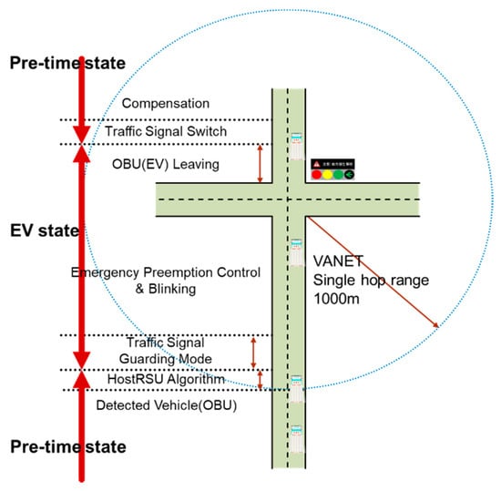 In Figure 4, assuming an EV is on duty and approaches to the intersection from the south, the RSU receives the EV message broadcasted from the OBU. Once the EV entering the 802.11p signal coverage range, seven stages will be done to complete the emergency vehicle signal preemption process including detected EV, determined host RSU, traffic signal guarding mode, EV preemption control, EV leaving, signal switch, and traffic flow compensation, then the system state switches back to the original state. Each phase has a specific control algorithm to deal with, which are discussed in the following sections.