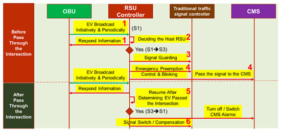 As shown in Figure 5, four components are interacted in the EVSP sequence diagram, which are OBU, RSU controller, traffic signal controller, and CMS. The interaction messages sequence can be divided into two phases, before and after the EV passed through the intersection, which are mapping to the seven stages illustrated in Figure 4. The RSU controller collects the EV message, decides if it should be responsible for the EV (host RSU), controls the signal control, and displays messages on the CMS. After EV passes through the intersection, the RSU controller switches back the signal, CMS, and starts traffic compensation as discussed later in Section 4.5.