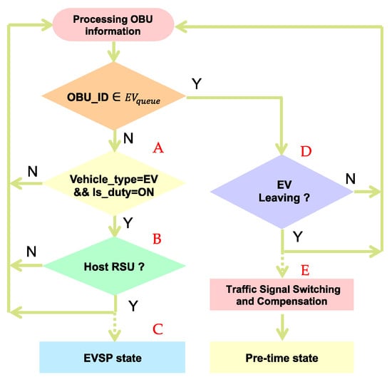 The major component where the EVSP control algorithm executed is the RSU controller, where the system flowchart is shown in Figure 6. The EVSP algorithm processes the OBU message, identifies the vehicle type and status (A), determines if it is the host RSU by the HostRSU algorithm (B), entering the EVSP state, and running the traffic signal control algorithm (C), determining if OBU leaves the intersection (D), and switches to the compensation mode (E).