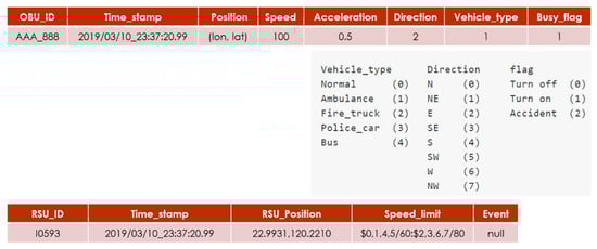 The STSC system communication protocol defines the message, format, frequency between the OBU, and the RSU, as shown in Figure 7. OBU periodically broadcasts the vehicle-to-RSU (V2R) message every second, the message fields are OBU_ID, TIME_STAMP, POSITION, SPEED, DIR, ACC, VEHICLE_TYPE, DUTY_FLAG, where time, position, and speed information collects from GPS module, id, type, and duty are the vehicle internal status. The DIR field determines the direction range (from 0–7), converted from the GPS data, is applied for matching the vehicle direction and RSU location, which is applied for the host RSU determination algorithm. DUTY_FLAG indicates whether the emergency vehicles is on duty or not.