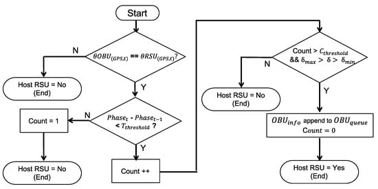 The HostRSU algorithm determines whether the RSU itself should be responsible for the approaching emergency vehicle. As shown in Figure 8, when the RSU receives a message, it first checks the EV approaching angle () and determines if it falls within the RSU service angle. The message will be ignored if the moving angle of the approaching EV does not fit into the RSU service range, which means that this EV may not move on sections of this intersection. The algorithm then double confirms the EVSP request by checking if the received OBU packets is more than a threshold (). The third check is the service range: the distance from the vehicle to the signal controller (δ) should fall into the service range predefined in the RSU; otherwise, it ignores the message. The RSU confirms it is the host RSU only if all these checks are passed, it then returns true and starts the EVSP process.