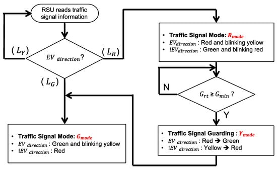 After the host RSU check, the RSU starts the EV signal preemption control process, where the control algorithm of this process is presented in Figure 9. RSU reads the current signal plan from the traffic signal controller, determining whether to extend the green period or cut off the red period to facilitate the EV passing through the intersection. The green mode (Gmode) indicates that the EV direction is currently in the green period and that it should remain green until the EV passes the intersection. If the EV direction is currently in red mode (Rmode), the signal controller should turn to green as soon as possible but still has to follow the minimum green constraints to ensure the safety of pedestrians.