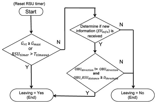 When the RSU is in EVSP state, it continuously monitors the state and position of the EV and determines if the EV leaves the intersection. As shown in Figure 12, the RSU starts a timer (RSUtimer), and continuously monitors if it is timeout or violates the maximum green constraint. The purpose of the timer is to prevent the RSU from staying in an EVSP state if information broadcasted by OBU without being received after EV leaves the intersection.