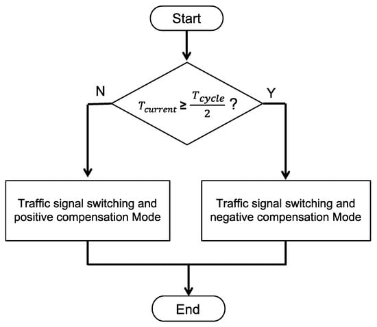 After the EV has passed through the intersection, the RSU switches back to original signal phase and starts the traffic flow compensation. The purpose of the compensation mechanism is to improve the vehicle’s continuation rate and reduce the unnecessary stagnation. Two compensation modes including positive compensation and negative compensation are designed, as shown in Figure 13, which enables the proposed STSC system to reduce the time of the signal coordination and is backward compatible with legacy traffic signal controllers. The RSU will switch to negative compensation mode if the current signal phase is more than half; otherwise, it switches to the positive compensation mode.