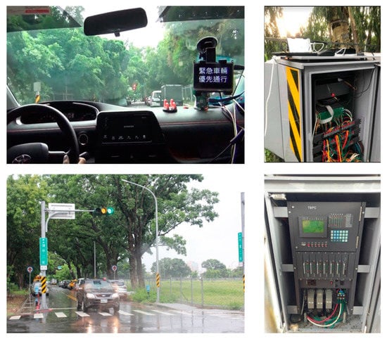 After the module test and integration test, an EVSP field test is done to verify the proposed STSC system. One signalized intersection in Pingshi Park in Tainan city is chosen for the EVSP field test. We cooperate with the domain experts from the Transportation bureau of Tainan city government to evaluate the EVSP scenarios. The test results are successful, both in the green mode and red mode cases when EV approaches the intersection. Some pictures of this EVSP field test are shown in Figure 16, and the field test video hyperlink is attached on the Supplemental Materials.