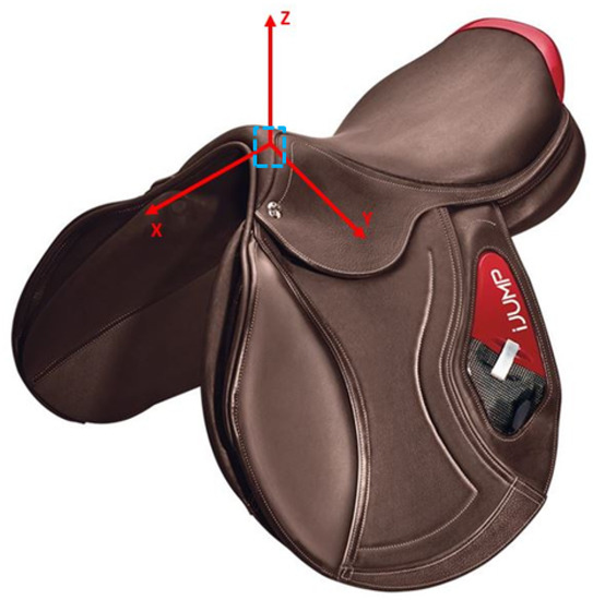 One IMU (LSM6DSL, STMicroelectronics, Geneva, Switzerland) placed in the saddle pommel close to the horse’s withers was used to measure tri-axial acceleration (range ±8 g) and tri-axial rotation rate (range ±2000 dps) at a sampling frequency of 100 Hz. It was fixed directly to the saddle tree, before its assembly. Data collected by the IMU were sent via a Bluetooth® antenna to a smartphone (iPhone X, Apple Inc., Cupertino, CA, USA) and then stored on an online server.