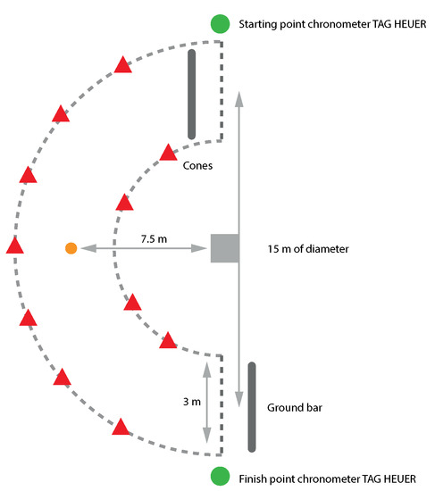 A curved path of a known perimeter was defined with cones and with a width small enough to limit the horse’s possible pathway (Figure 3). The traveled distance was calculated as distance = , with r the radius of the circle.