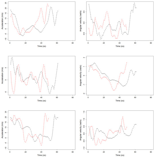 One stride acceleration (left) and angular velocity (right) signals for the x-axis (top), y-axis (middle), and z-axis (bottom). The red curve corresponds to a running speed of 8.6 m/s, and the black one corresponds to a running speed of 5.0 m/s.