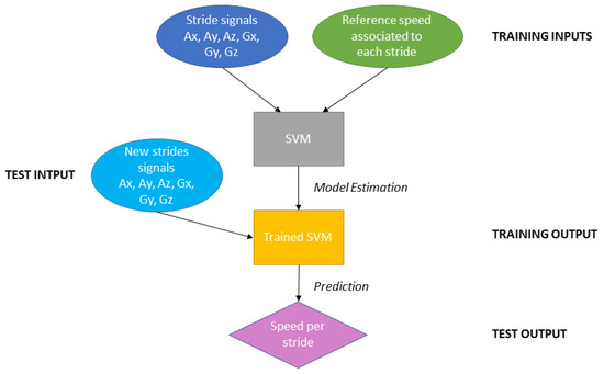 To sum up, the six signals collected with the accelerometer and the gyroscope for each “stride” were matched with the measured reference speed for the stride. This was used as input data to train the SVM model in order to obtain the best speed estimation for new data in the future. All this process is illustrated in Figure 5. The model was developed with R software and the svm function of e1071 package [25].
