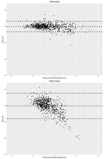 The Bland and Altman plot of one SVM repetition is shown in Figure 6 (top), with one circle corresponding to one stride. The speed predicted by the model and the measured speed of the stride were compared. The mean bias was zero, which meant that on average, the SVM model output was close to the measured speed. If the model predictions were perfect, all the points would be aligned on the zero line. The points that were the farthest from the zero line were the worst predictions. We can see that for some strides of low speed (below 5 m/s), the SVM model had a tendency to overestimate their speed; whereas for some strides of high speed (above 5 m/s), the SVM model had a tendency to underestimate them. Nevertheless, 95% of strides had a bias lower than 1 m/s, which was satisfying according to this work’s objective to reach an accuracy of 0.6 m/s; whereas ODBA estimations (Figure 6, bottom) were more variable than SVM ones. The mean bias was also zero, but the 95% confidence interval was twice the size of the SVM one (cf. Table 1), that is to say high above our objective value. The ODBA method was more variable than the SVM one, with 95% of strides’ bias lower than 2.5 m/s and a clear tendency to underestimate strides of high speed.
