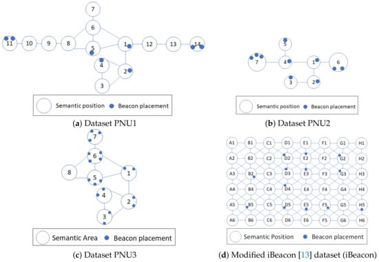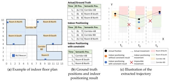 Erroneous indoor positioning can give rise to invalid trajectories, which contains at least one impossible movement between a pair of consecutive positions. Suppose that an indoor positioning technique mispredicts the current position to be in the next room, which is impossible because a wall separates the previous position, while the room and the room’s door are on the farther side. Another case of erroneous indoor positioning is the “jumpy” transition due to the missing and unstable RSSI data. Hence, the estimation of the current position is significantly deflected from the previous position. Thus, we would like to adopt the contextual outdoor area definition [,,] to incorporate the structure of the indoor space. We call this newly defined area semantic position.