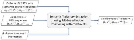 Our problem, depicted in Figure 2, is described as follows. We need to extract valid trajectories from the input of unlabeled BLE RSSI sequences in an indoor environment while the user is moving. To perform this, we use the ML-based indoor positioning with constraints that learns the characteristic of the BLE RSSI sequences from the previously collected BLE RSSI dataset with semantic position sequences as labels. The movement constraints come from the indoor floor plan, which represents the information of the indoor environment. These movement constraints are represented by a semantic graph in later parts.