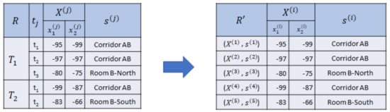 In Figure 3, we collect two sequences of RSSI observations with semantic position and using two beacons as reference set R, where consists of three RSSI vectors and consists of two RSSI vectors. Then, we drop the sequential relationship, symbolized by the timestamp and sequence . Hence, we acquire , where , as the nonsequential reference set.