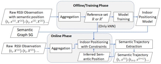 The semantic indoor trajectory extraction process is similar to RFID cleansing [,,]. Similar to Reference [], we do not assume that all detailed characteristics or spatiotemporal constraints of the BLE beacons in the indoor environment are known. This case is different from previous works [,,] where a position was directly related to a beacon. According to Reference [], the learning-based method cleans the RFID of the trajectory data to an RFID observation at a time. In our case, we may capture the RSSI signals from different beacons or miss the signal completely at some semantic positions. Thus, we leverage the machine learning-based approach to infer the semantic location from the overlapping and missing observations.