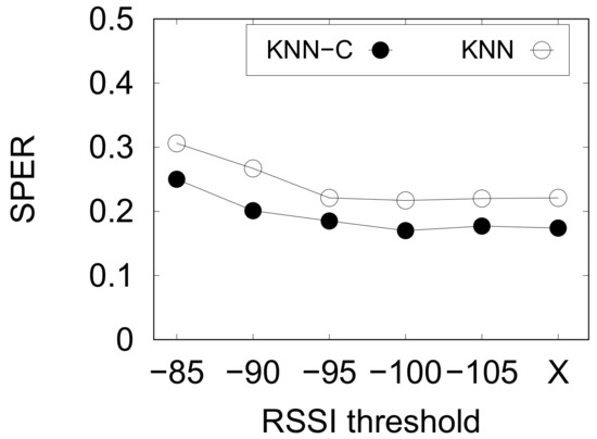 Previously, in Section 3.2, we mentioned that weak RSSI may happen due to several circumstances. However, this might be useful for the ML-based indoor positioning to learn the weak RSSI characteristics. We present the result of this preliminary study using kNN-based methods and PNU1 dataset in Figure 9. We denote no threshold as “X” in the chart.