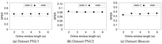 Figure 10 shows the performance of HMM-based methods based on SPER. Note that the original approach gives straight lines as we perform the estimation using the full trajectory. It is evident that the online MHMM does not exhibit any significant difference if the subsequence window length w is increased. However, we do not want to set this parameter at a large value as it delays the prediction time. Overall, HMM-C is comparable to its optimal original approach except in dataset PNU1. This indicates that HMM-C is almost as effective as the original HMM even though it does not see the full trajectory.