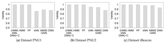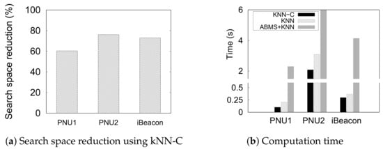 Figure 11 presents the efficiency of the three kNN-based methods, including the reduced search space in each dataset. In this experiment, we fix the number of neighbors (k) to 10 to estimate a semantic position. With the efficiency, we confirm the feasibility of each method in a real-time. It is evident that ABMS + kNN consumes the longest computation time to perform an estimation, followed by a significantly shorter time for kNN, and the shortest time for kNN-C. The search space reduction by the constraints (Figure 11a) highly influences the computation time of kNN-C (Figure 11b). The computation time largely decreases from the original kNN because kNN-C reduces the reference set/search space size owing to the movement constraints from the previously inferred position. In a current inference of position , kNN-C only looks for the neighboring semantic position from the previous position instead of observing all instances of the reference set. ABMS + kNN performed poorly because it performs kNN until the inferred position does not change or converges. The prediction time of ABMS + kNN is nearly 10× that of kNN. Even in the largest dataset, PNU2, it needs more than 6 s to predict a single position. Thus, We can conclude that ABMS + kNN is not suitable for real-time inference due to the long prediction time. This result shows that the constraints significantly reduce the cost of computation for indoor positioning.