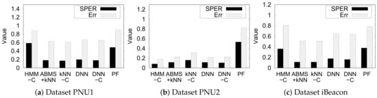The error and SPER have slightly different effectiveness measures in indoor semantic positioning. As described before, error does not consider the distance between the predicted semantic position and the ground truth at time t. We fixed the parameters of each method according to the default value in Table 4 (HMM window length = 3, k = 10, and DNN hidden layers = 4).
