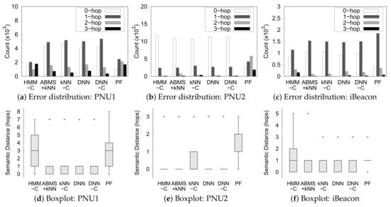 The error analysis in Figure 14 shows more details about the performance of each method and the reason for using SPER instead of error. Figure 14a–c shows the count distribution of the hops needed to travel from the correct semantic position to the predicted semantic position for each dataset in the semantic graph (semantic distance). We only show the count of the four smallest distances in the figure because the number of ground truths and predicted semantic position pairs gets significantly smaller for the larger distance. We see that ML-based methods mispredict the majority of the semantic position with a distance of 1 hop in all datasets, except for HMM-C in dataset PNU1. If we use only error, we cannot capture this detail because error only considers the count of a 0-hop distance of the ground truth and predicted positions. Figure 14d–f shows boxplot of the semantic distance from the correct semantic position to the predicted semantic position for each dataset. The boxplots reflect similar insights to the error distribution for the majority of the misprediction with a 1-hop distance. The indoor positioning techniques still predict a small amount of positions that are far from ground truth as outliers, except for the particle filter in PNU1 and PNU2 dataset. Thus, it is evident that the particle filter performed poorly in every dataset.