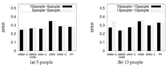 Figure 16 shows the performance of the indoor positioning methods on a dynamically changing environment using dataset PNU3. We omit the original kNN and HMM again for brevity. We denote each result as (training)-(test) notation. For example, in the chart, the “10people-5people” result means we train the model using the 10 people setting and test the model using the 5 people setting. Particle filter gives exactly equal results because it does not train any model and works directly on the test. Interestingly, most of the methods give slightly similar or improved results of the dynamic setting (10 people-5 people and 10 people-13 people) to its original setting counterpart (5 people-5 people and 13 people-13 people), except for HMM-C that significantly improves the performance of the 13 people setting using the 10 people dataset. We can infer that a carefully selected environment as training set can improve the performance of the indoor positioning of a dynamic environment.