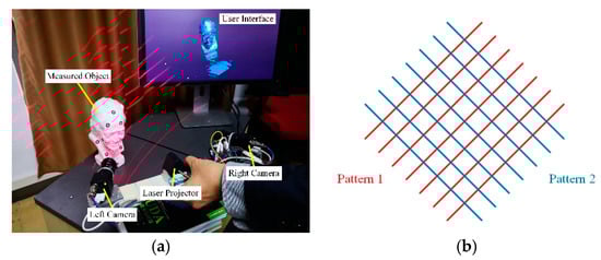 Schematic of the 3D laser scanning system; (a) components of the 3D scanner; (b) laser patterns; there are two kinds of projection patterns shown as red and blue respectively; we alternately project them onto the measured object; once one of the patterns is extracted, it will switch to the other immediately; the reflection of these two patterns will form multiple intersecting curves on the object.