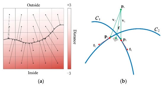TSDF constructed from 3D curves is a vector field, which is different from the classical signed distance field []. As shown in Figure 2a, each voxel v in a field stores the distance vector to its closest point on the reconstructed surface. The vector’s direction is parallel to the normal of the closest point on the surface. The sign of the distance indicates whether a voxel v is inside or outside the surface. If v is outside of the surface, its sign is positive, and if v is inside the surface, its sign is negative. Since voxels that are too far from the surface have little effect on the surface construction, the distance field is truncated at distance . Truncation T affects not only the effect of surface reconstruction but also the runtime performance and memory consumption of the algorithm. On the one hand, if T is set too large, the surface details will be smoothed out. At the same time, increasing T means processing more voxels, thus slowing down the algorithm and consuming more memory. On the other hand, if T is smaller than the level of noise, it will lead to the appearance of isolated patches around the reconstructed surface. Therefore, it is generally appropriate to set T to the minimum value larger than the noise level of the apparatus, which is 0.9 mm for the scanner used in our experiment. Truncation T is also the leading cause of thin-surface problems in TSDF. How T affects thin-surface reconstruction will be mentioned in the next section.