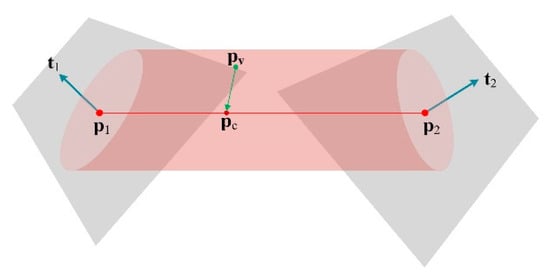 An example of the fundamental cell of the line segment ; t1 and t2 are the tangents at each endpoint of the line segment; all voxels in the cell must be located between the two planes perpendicular to the two tangents and the distance from the central point pv of voxel v toward the closest point pc must be less than the cylinder’s radius (envelope size).