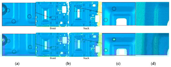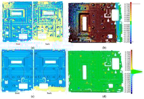 Optimization of the 3D surface reconstruction of a sheet metal part; (a) results of Tubić et al. []; (b) deviation colormap between Tubić’s 3D model and the computer-aided design (CAD) model; (c) results of the proposed method; (d) deviation colormap of the proposed method.