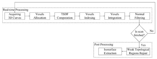 The above content briefly introduces method of Tubić et al. [] of generating a surface model from a set of intersecting 3D curves. This method is topologically flexible and has linear complexity, but it cannot reconstruct the surface of very thin objects. We use a laser line scanner to measure the 3D curves from the surface of a sheet metal part with a thickness of 0.8 mm and use method of Tubić et al. to reconstruct the surface mesh model of this object, which is shown in Figure 4a. The resolution (voxel size) of the model is 0.5 mm, and the size of the truncation (also known as the fundamental envelope) is 0.9 mm. Tubić’s output has a large area of data missing, and its distance (one-sided Hausdorff) to the computer-aided design (CAD) model is greater than 0.2mm (Figure 4b). We optimize the robustness of Tubić’s method to thin objects. With the same resolution and truncation, the optimized results not only guarantee the completeness of data (Figure 4c) but also guarantee its maximum distance (one-sided Hausdorff) to the CAD model within 0.2 mm (Figure 4d). The proposed thin-surface optimization of Tubić’s method is described in Section 2.2 and Section 2.3. Figure 5 shows the whole pipeline of the proposed algorithm. The algorithm employs a hash table to organize the underlying voxel data. The content related to the underlying data structure can be found in Section 2.4. The whole procedure of the proposed 3D reconstruction algorithm can be summarized as the following seven steps: