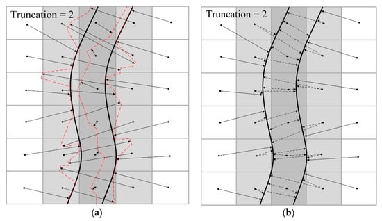 As mentioned earlier, TSDF has a disadvantage for reconstructing thin surfaces. The distance field extends a band, i.e., truncation, both inside and outside the observed surface. When the surface’s thickness is less than the width of the truncation band, the values of distance fields that encode opposite sides of the surface will interfere with each other, leading to the effect that the rear surface cannot be recovered from the fields. Figure 6a shows a 2D slice of a corrupted thin surface. Black solid lines represent the real surface of a thin object, and each solid arrow indicates a value in the distance field. The truncation distance of the field is two times of voxel size, and the interfered voxels are colored gray; the darker their color, the higher the impact. Unaffected lattices are white because they are too far from the other side of the surface. These arrows of interfered voxels do not point to the real surface, but to multiple false surfaces that are represented by red dotted lines. Therefore, the correct method is to store two vectors (dotted arrows) in a gray lattice, as shown in Figure 6b. That is to say, each voxel in the overlapping region should encode two tangent planes that are on different real surfaces. It is first necessary to determine which side of the thin surface each TSDF observation originates from during online scanning; we call this process thin-surfaces attribution judgment.