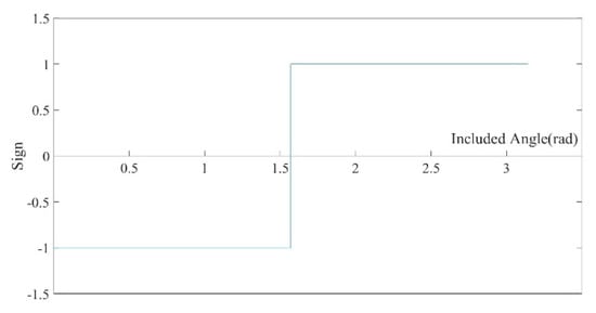Figure 7 depicts the plot of the sign S varying with the angle α between vector ndis and line of sight Vv. As shown in Figure 7, near the critical point (), a slight change in the angle will cause the sign S to be flipped. Small perturbations of data (related to the accuracy of apparatus) will lead to a certain degree of deviation in normal estimation. When the angle between the line of sight and the surface normal , the error of normal estimation will lead to an inaccurate sign of TSDF, which will make the misjudgment of the thin-surface attribution. Meanwhile, the reliability of the measures obtained in this case is also relatively low. Therefore, a current measurement reliability judgment is added to the process to determine whether the thin-surface attribution judgment can be turned on. When the line of sight and the surface normal are almost perpendicular (), the current measurement is judged to be unreliable and discarded. Conversely, the thin-surface attribution judgment is turned on, and the current observation is integrated into the corresponding voxel determined by the thin-surface attribution judgment.