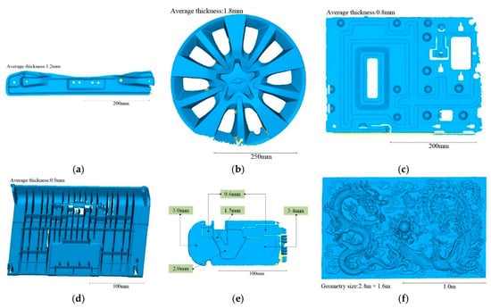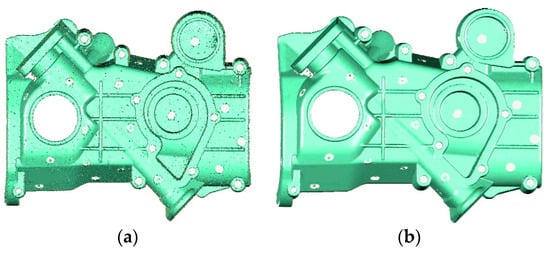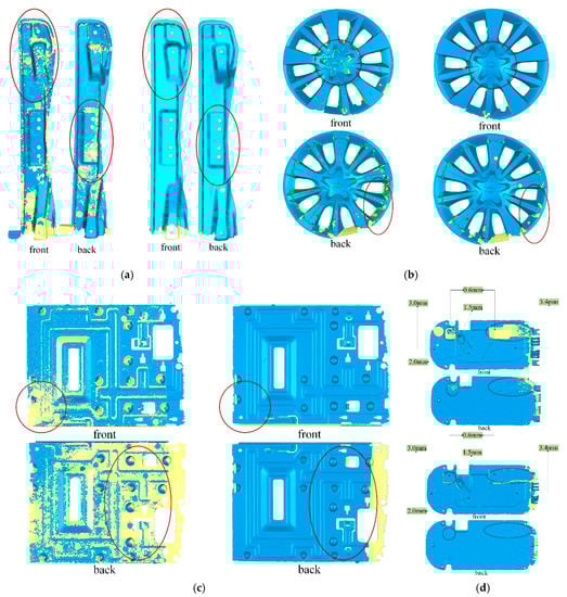 Quantitative analysis results can confirm the conclusion of qualitative evaluation. Whether it is a thin object with simple topological structure (sheet metal part) or complex topological structure (plastic shell), the deviation between the reconstruction of our method and CAD model is the smallest (the minimum mean and Std.). Taking the mean as the evaluation metric, our method significantly improves the accuracy of the original method of Tubić et al. [], but it shows similar accuracy to the other two existing scanners (Creaform [] and Scantech []). If Std. is used as the evaluation metric, our method is significantly different from other existing methods (Tubić et al. [], Creaform [], and Scantech []). Our method is more stable than the existing approaches. Moreover, for the thin object with complex topological structure, it can significantly improve the reconstruction accuracy by the proposed post-processing method.