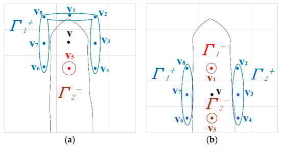 Figure 9. The 2D representation of the critical points identification method; the solid black line represents the actual surface; the neighborhood of voxel v is divided into two sets; (a) voxel v, positive set {v5}, negative set {v1, v2, v3, v4, v6, v7, v8}, positive set and negative set constitute two connection groups Γ1+ and Γ2− (red and blue circle), so v is not a critical point; (b) the voxel v, positive set {v2, v3, v4, v6, v7, v8} and negative set {v1, v5}; the two sets are divided into four connection groups Γ1−, Γ2+, Γ3−, and Γ4+, so v is a critical point (there are four groups in 2D, but only three in 3D). - Generate weak topological regions: take each critical point Pc as a seed point, find connected component Pg (a region of adjacent voxels) of Pc within a specified range (such as two times of the voxel size), and the dot product of the normal less than a certain threshold Tdot. Figure 10 shows weak regions detected by our method. This model has many stiffeners with a thickness of about 1 mm. When the truncation is also set to 1 mm, the surface model is prone to generate topological errors in the location of these stiffeners. The proposed method can detect these weak topological regions (the red areas in the figure), and the method of repairing topology errors will be described in the next section.
