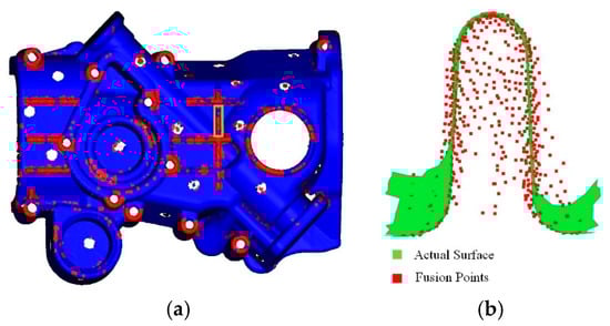 Figure 10. The effect of weak regions detection; (a) point clouds are generated from TSDF by Equation (4); the non-critical point is marked blue, and the critical point is marked red; (b) a cross-section of a weak region (the green box in Figure (a)); there are many points inside the surface that do not fall on the actual surface; these cause the generated surface mesh model to shrink to the inside of the object.