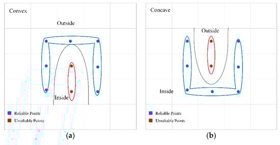 The distribution of reliable and unreliable points in weak regions of convex and concave surfaces; reliable voxel centers are blue, unreliable voxel centers are red; (a) distribution of weak regions for convex surfaces; (b) distribution of weak regions for concave surfaces.