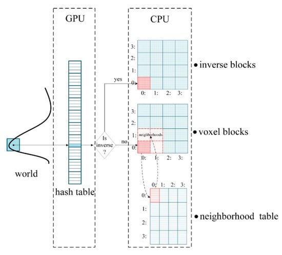 Hashing-based fusion methods can even run on mobile platforms with relatively low computing capability, such as tablets and mobile phones [,,,]. Based on the work of Nießner et al., Kahler et al. improved the storage structure of the hash table to reduce the impact of hash conflict []. Moreover, they have developed a hierarchical structure based on hash with few levels to improve storage efficiency further []. A method called structured skip list also has been proposed to increase the number of voxels that a hash table can accommodate []. Although these improved hashing methods alleviate the memory pressure to some degree by compressing data, they do not solve the problem from the root. GPU memory still limits the spatial extent and resolution of the voxel grid. Nießner et al. alleviate the memory pressure of GPU through bidirectional GPU–CPU streaming, but the GPU memory may still be exhausted when reconstruction scenarios are very dense. Our second contribution is to improve the data structure of voxel hashing. We only store hash tables on the GPU, and all voxels are stored on the CPU; thus, the limitation of GPU memory capacity is lifted on the scale of the reconstructed scene.