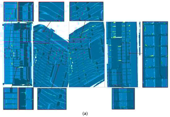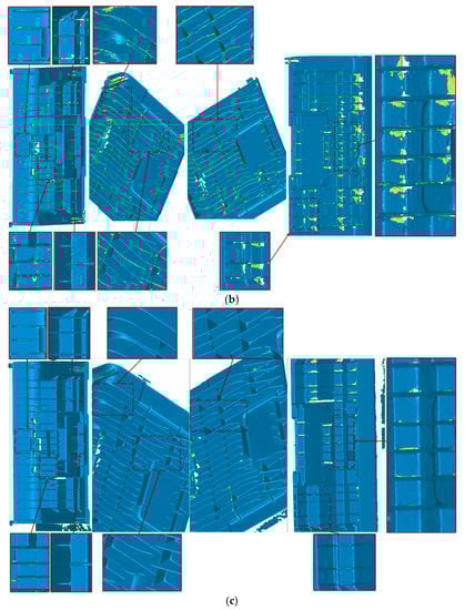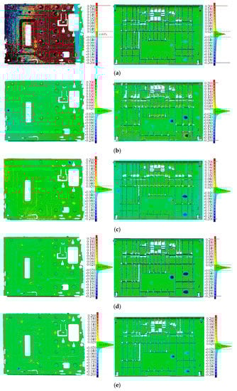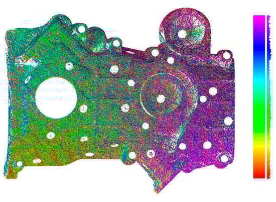 For the difference of Std. between each group of samples, we conduct the F-test of equality of variances [], as shown in Table 8 and Table 9. Let σi2 be the variance of the population corresponding to a column in the table, and σj2 be the variance of the population corresponding to a row. For each grid in the table, H0: σi2 = σj2, H1: σi2 > σj2. If p < 0.05, we reject the null hypothesis and conclude that σi2 and σj2 have a significant difference. For the sheet metal part, the variance of each group can be sorted as follows: Tubić et al. [] > Creaform [] > Scantech [] > Our approach; there is no significant difference between our real-time approach and post-processing approach at the significance level of 0.05. For the plastic shell, Tubić et al. [] > Creaform [] > Our real-time approach > Scantech [] > Our post-processing approach.