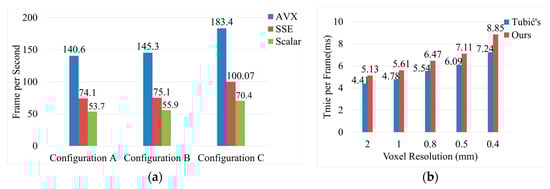 Time efficiency comparison; (a) frame rate comparison of real-time reconstruction algorithms on three different hardware configurations in Table 2; the blue bars represent the algorithm implemented with Advanced Vector Extension Instruction Set (AVX) [], red bars represent Streaming SIMD Extensions Set (SSE) [], and the green bars represent the version with no instruction sets; (b) performance comparison with Tubić et al. [].