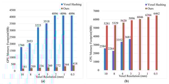 Figure 20 compares the CPU memory usage and GPU memory usage of our proposed method and VoxelHashing [] method. The comparison was made on a device with Configuration A. When the voxel resolution was increased to 2 mm, VoxelHashing [] had already filled up all of the 4 GB GPU memory and made the program crashed, which significantly limited the algorithm’s practicability since most of the GPU hardware devices on the market only supported 4 GB memory. In contrast, the GPU memory footprint of our proposed method was insignificant compared to voxel hashing []. Although the CPU memory footprint had increased, it was acceptable (up to 6 GB). After all, most computer devices support CPU memory expansion.