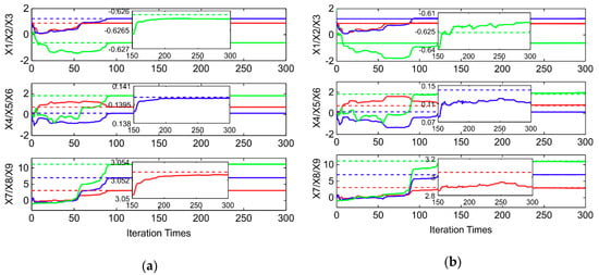 The ellipsoid and sphere fitting results obtained from 300 simulations of the measurement model (1) are shown in Figure 1. Moreover, the changes in the state vector with or without noise are plotted in Figure 2. The initial state vector by assuming zero external magnetic field interference, i.e., is assumed as a unit matrix; is the zero vector in Equation (7). The initial covariance matrix for the state vector must be set sufficiently large to achieve a better estimation. If is very small, the state vector may converge well earlier. Thus, an optimal estimation may not be achieved in the following recursive algorithm. In this paper, the value is selected as . In Figure 2, the red, blue, and green lines represent the order of parameters, and the dotted line represents the real value. For example, in the top image in Figure 2a, the red, blue, and green lines denote , and , respectively. A comparison of Figure 2a,b indicates that the state vector without noise is almost equal to the real vector calculated using the given parameters, whereas the state vector with noise is not equal to the real vector. This result clearly demonstrates that the RLS method is a biased estimation method.