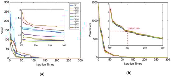Figure 3a plots the changes in the square root of the diagonal elements of the covariance matrix with noise, which clearly converges well after 200 iterative operations. Thus, the parameter at the 200th iteration can be considered the threshold to detect if the state vector has converged. To obtain sufficiently and reasonably, 80 Monte Carlo (MC) runs were performed. The variation curves of the MC runs were concurrent, as shown in Figure 3b. Further, this result agreed well with the expected results. Finally, the threshold is selected as the mean for all the 80 MC simulations.